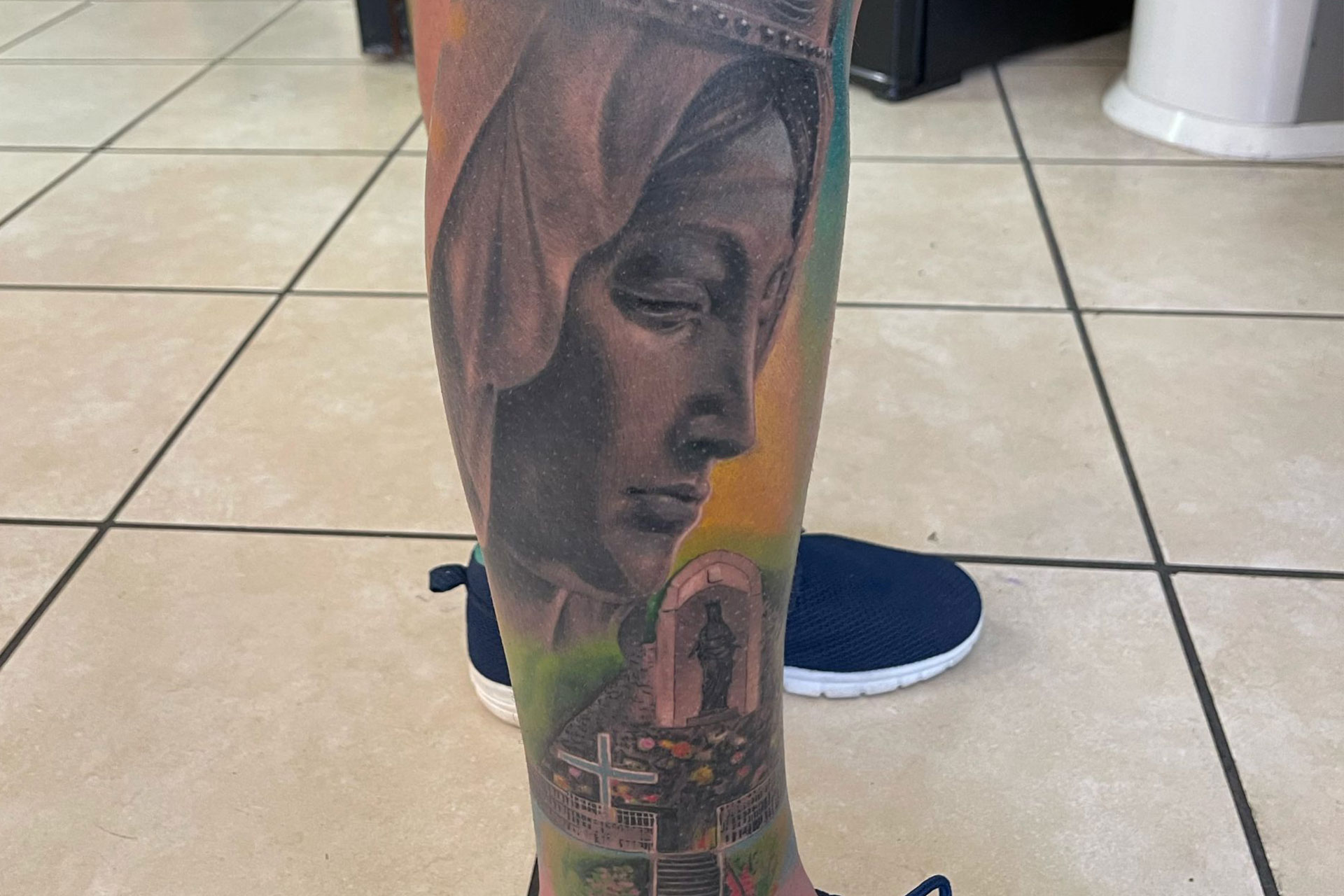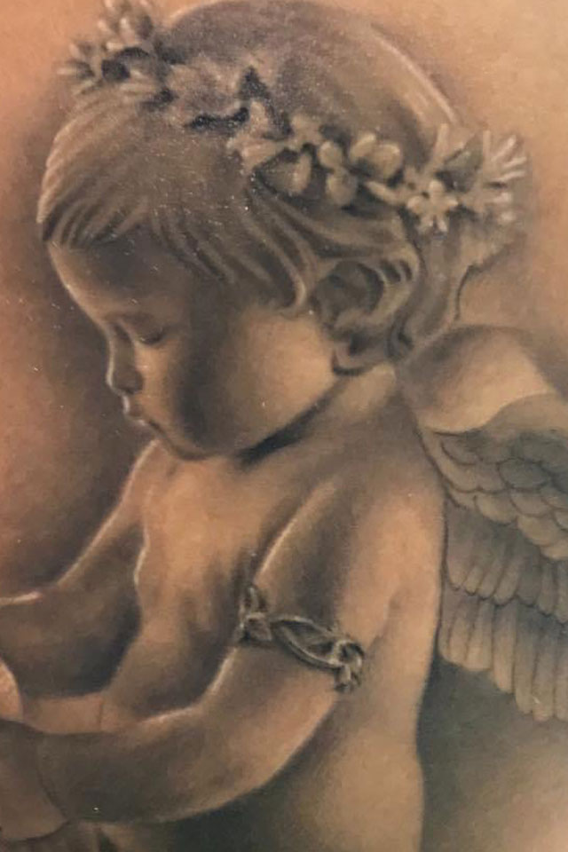 Un tatouage d'ange, symbole d'espoir et de protection, réalisé avec une précision remarquable. Chaque détail est soigneusement travaillé pour capturer l'élégance et la pureté de l'âme céleste. Un design raffiné qui allie profondeur spirituelle et qualité artistique.